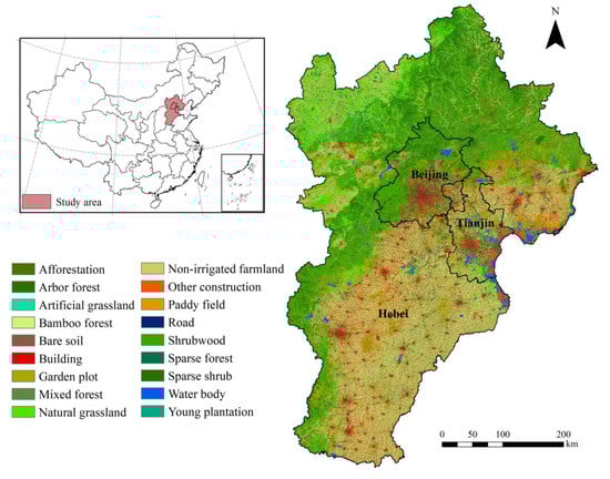 The BTH region is in the heart of the Bohai Sea in northern China, including two municipalities, Beijing and Tianjin, and 11 other prefecture-level cities in the province of Hebei (Figure 1). It has a temperate monsoon climate and covers about 216,900 km2, accounting for 2.3% of the total land area of China []. In terms of topography, the altitude gradually decreases from the northwest to the southeast in the BTH region, with the Bashang Plateau in the north, the Yanshan-Taihang Mountains in the northwest, and the coastal plain in the southeast. Important reservoirs such as Miyun and Huairou are in the northeast of the BTH region. In 2018, the total GDP of the BTH region reached CNY 8.5 trillion, accounting for 9% of the national GDP [,,]. Since the promotion of the national strategy for the coordinated development of BTH, the regional linkages of the three places have been strengthened, and the integrated spatial planning of ecological protection has been emphasized. How to protect and restore the ecological environment and how to promote the harmonious coexistence of economy development and ecosystem protection are the main challenges.