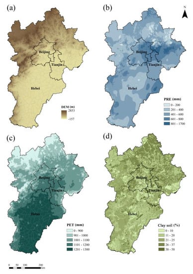 Data examples used in the study: (a) digital elevation model (DEM), (b) precipitation (PRE), (c) potential evapotranspiration (PET), (d) clay soil percentage.