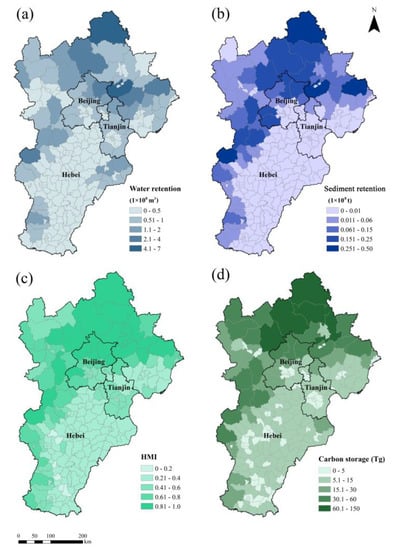 The key ecosystem services are selected on the basis of the natural conditions and the critical environmental issues in the BTH region. For example, the Yanshan-Taihang Mountains, which are the source of the Haihe River, are important areas for water retention, and the forest ecosystem in the mountainous area of north and northwest plays a crucial role in carbon storage. The soil and rock surfaces and loess hills in this region are the key control areas of soil and water loss []. The expansion of human construction has led to forest and wetland degradation and fragmentation [,], as well as water shortages in the Miyun Reservoir and the Chaohe River Basin []. In general, intensified human activities in BTH have exerted significant pressure on the environment and related risks of climate change []. In view of this, four ecosystem services (i.e., water retention, soil retention, heat mitigation, and carbon storage) were selected on the basis of the urgent needs of ecosystem services and data availability and then spatially quantified by InVEST, a widely used tool. This tool provides effective models for the quantitative analysis of ecosystem services. The models and detailed parameters are provided in the Supplementary Document.