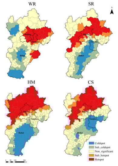 Spatial hot spots and cold spots of ecosystem services in the BTH region, including water retention (WR), soil retention (SR), heat mitigation (HM), and carbon storage (CS).