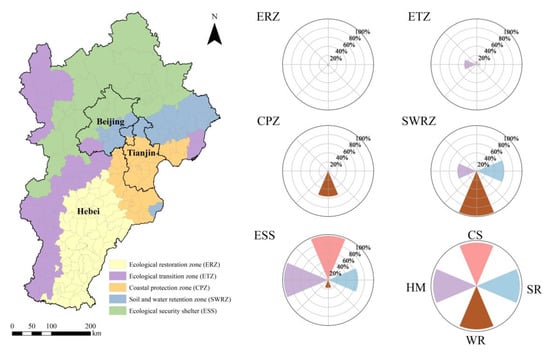 Only the hot spots of ecosystem services were used in spatial clustering because the cold spots were not significantly related to function-oriented zoning. According to the characteristics of ecosystem services supplied in each cluster, five functional zones were identified, namely the ecological restoration zone (ERZ), ecological transition zone (ETZ), coastal ecological protection zone (CPZ), soil and water retention zone (SWRZ), and ecological security shelter (ESS) (Figure 5). The pie chart in Figure 5 represents the area ratio of hot spots and sub-hot spots of ecosystem services in different zones to the total area of the zone, which can reflect the contribution of different services to the zone.