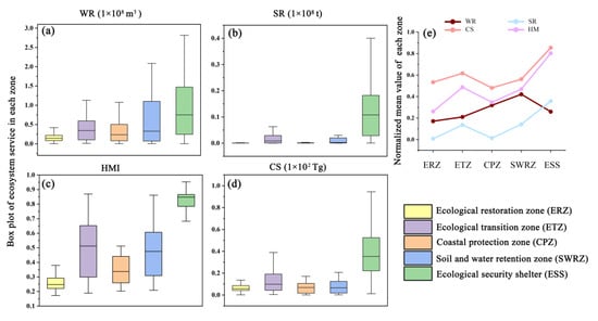 Statistics of ecosystem services in different ecological zones (a–d) and comparison of the normalized mean value of each zone (e).
