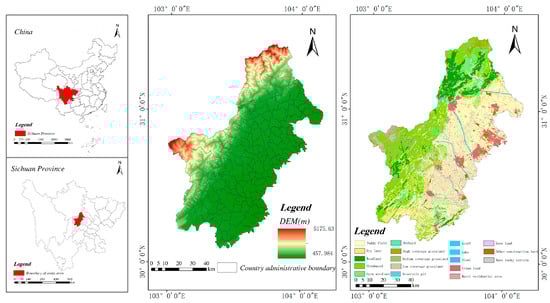 This study used land cover type data with a 30 m spatial resolution for 2000, 2010, and 2020, which was produced by the Institute of Resource and Environmental Science and the Data Center of the Chinese Academy of Sciences (https://www.resdc.cn/ (accessed on 1 May 2022)), by visual interpretation using Landsat MSS, Landsat TM/ETM, and Landsat 8 data [17]. In addition to land-use data, we also collected other multiple-source data, including natural condition data and social condition data, to meet the needs of evaluating land-use functions. As for the social conditions, we calculated the distance datasets using the “Euclidean Distance” analysis function in ArcGIS 10.6, containing the distance from the main roads above the county level (DR), the distance from major rivers (RIV), the distance from the township (DT), the distance from education facilities (DEF), and the distance from medical facilities (DMF), with road and river data, and a facility data download from the Baidu map. Soil quality was supplemented by the Institute of Resource and Environmental Science and the Data Center of the Chinese Academy of Sciences and CASEarth (Big Earth Data for three poles, http://poles.tpdc.ac.cn/zh-hans/ (accessed on May 2022)), for e.g., the content of organic, phosphorus, potassium, pH value, erosion, soil texture type (ST), and agricultural output per km2. Weather and terrain data, including slope, elevation, geological disaster probability (GDsP), average annual temperature (AT), and average annual precipitation (AP), were also collected, mainly provided by the Institute of Resource and Environmental Science and the Data Center of the Chinese Academy of Sciences, as well as economic (GDP per km2) and population data (pop per km2). As for the ecological evaluation, we used data produced by the Institute of Mountain Hazards and Environment in Chengdu, which is a branch of the Chinese Academy of Science, namely water and soil loss vulnerability (WSLV), water conservation (WC), soil conservation (SC), and biodiversity conservation (BC).