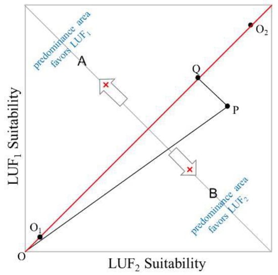 The method most used when identifying the land-use conflict zone involves the construction of 27 combinations of multi-land use functions by categorizing each special unit into strong (S), medium (M), and weak (W) levels, according to the natural breakpoint. The deficiency is apparent when used in later analysis, due to too many conflict types, even though scholars merged all the elements into 8 strong categories and 16 medium categories [8]. We constructed a new suitability conflict assessment index normalized by using the newly emerged calculation method for land-use multi-functional trade-off synergy status [20]. Figure 3 shows the conflict potential between specifical land-use functions (e.g., and ). Points O1 and O2 are located on the 45° straight line, representing the ‘weak-weak’ and ‘strong-strong’ combination, respectively. The stronger the conflict level will be when a spatial unit is closer to point O2. The distance away from the 45° straight line in the A and B regions represents the relative advantage favoring the or . We define |OP − PQ| as the quantitative index to measure the degree of suitability conflict potential. The detailed calculation equation is as below: