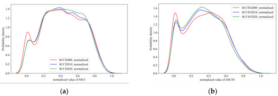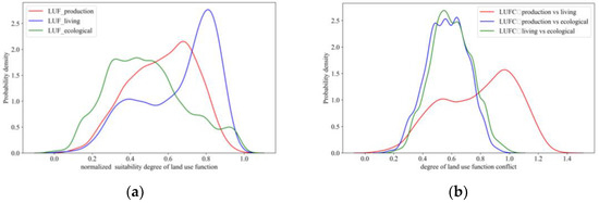 Probability density diagram of (a) the normalized land-use function suitability evaluation and (b) the land-use function suitability conflict.