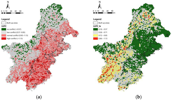 Distribution of land-use function suitability conflict. (a) Considering production–living–ecological conflict and (b) only considering living–ecological conflict.