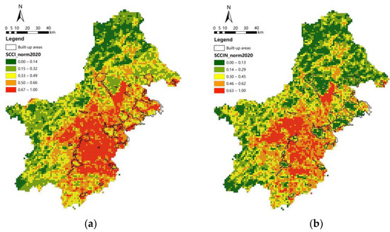 The land use and conflict measurement index, both SCCI and SCCIN, measure the relative degree of conflict risk within a region. However, compared with SCCI, this paper’s newly constructed index, SCCIN, has significantly reduced the number of high conflict units and increased the number of low conflict units in all 3 years, 2000, 2010, and 2020 (Figure 6). While the main difference between the two formulas is land-cover types, it indicated that the structure of land-cover types contributes greatly to the landscape ecological risk in the traditional calculation method, as the traditional landscape ecological risk measurement method focuses on the risk impact of the composition of construction land patches, rather than the characteristics of the land use configuration pattern. Taking the year 2020 as an example, the conflict risk units identified with SCCIN are almost contained in those with SCCI (Figure 7). However, the conflict risk inside urban built-up areas and at the edge of built-up areas is significantly reduced. Even though there are also ecological, water system, and other non-construction land in the urban built-up area, the possibility of land-use transfer are far lower than that outside in the countryside, which results in the difficulty for SCCI to reflect the resilience resistance landscape ecological risk itself inside built-up areas, proving that the SCCIN constructed by this paper to be more reliable.