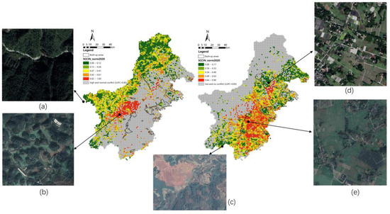 Compared with the degree of suitability conflict potential (LUFC), the spatial agglomeration of the conflict units defined by the landscape pattern is more obvious, forming relatively continuous conflict agglomeration areas. As shown in Figure 8, while beyond a certain landscape risk degree, namely 0.2, the higher the LUFC, the stronger the landscape complexity (SCCIN), this is mightily due to more intense “competition” between the different functions for land space, resulting in the mixing of agriculture and forestry land or mosaic landscape patterns in these regions. So, special attention should be paid to areas with high conflict risk accordingly, from the perspective of the regional agricultural–ecological landscape and the protection of the settlement landscape with the local feature. Specifically, the four kinds of relationship situations between the LUFC and SCCIN are as follows: (1) units of low functional suitability conflict and low landscape complexity conflict, mainly concentrated in areas with ecological advantages in deep mountains, as shown in Figure 9a, where suitability for agricultural production and urban–rural living is poor; (2) units of low functional suitability conflict and high landscape complexity conflict, as shown in Figure 9b, mainly concentrated in the shallow mountain and hilly areas, dominated by the mixture of ecological space and agricultural production space. Agricultural land in the valley is continuously distributed along the terrain, resulting in land use vulnerable to the impact of land consolidation projects, such as “slope upgrading, land greening or returning the forest to farmland”; (3) units of high functional suitability conflict and low landscape complexity conflict, as shown in Figure 9c,d, while the former is dominated by the large scale of farmland or forest land, and the latter is dominated by high density and relatively homogeneous rural settlements, which are generally identified as construction land patches in 30 m resolution remote sensing recognition, resulting in lower landscape complexity; and (4) units of high functional suitability conflict and high landscape complexity conflict, as shown in Figure 9e, where the residential area is more sparse and the density is lower, the agricultural production space and urban–rural living space are mixed.