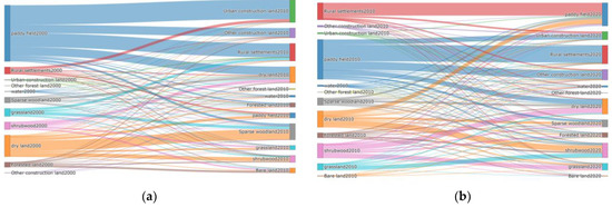 Sankey diagram of land-use transfer (a) from 2000 to 2010 and (b) from 2010 to 2020.