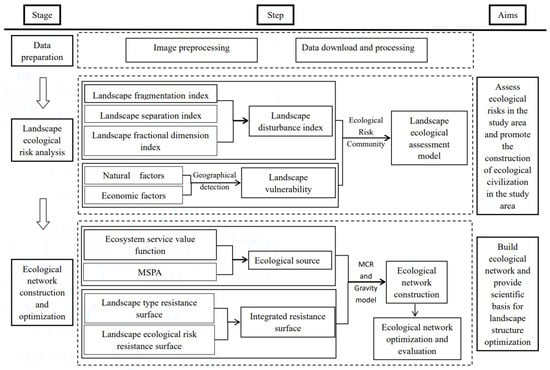 In view of the theory of landscape ecology, a landscape ecological risk assessment model based on landscape index was constructed. Ecological risk assessment results (obtained using Kriging interpolation of landscape pattern index) and landscape types were chosen as the main factors that constituted the comprehensive resistance surface. Then, the MCR model was used to construct and optimize the ecological network. The specific process is shown in Figure 3.