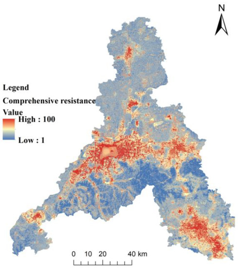 The resistance surface refers to the resistance that needs to be overcome in the process of material flow in the ecosystem [46]. Different landscapes resulted in different resistances, as shown in Table 4. In addition, ecological risk reflected the degree of loss in the ecosystem after external interference. The assignment ranges of ecological risk index are shown in Table 4. Based on the two kinds of factors, this paper constructed a comprehensive resistance surface. The weight of land-use type was 0.6 and ecological risk index was 0.4. The results are shown in Figure 8.