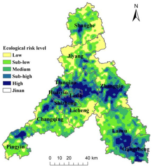 With the limitation of the available high-resolution data, this paper only assessed the landscape ecological risks in Jinan in 2019. The impact of spatial changes in land use/cover on ecological risk assessment should be considered. Long-term change in landscape ecological risk could be helpful to further understand where the regional ecological quality is improving and where it is declining.