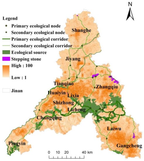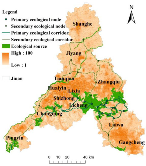 The primary ecological corridors and ecological nodes were mainly distributed in Changqing, Licheng and the southern part of Laiwu. With concentrated ecological sources and the landscape dominated by forest, these areas should be well protected for the ecological environment of the study area. Other secondary ecological corridors were mainly distributed at the edge of Jinan, far from the main urban areas of Jinan and the areas with relatively large building coverage.