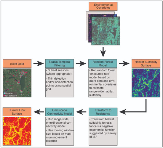 For each focal species, our basic workflow involved using detection data from eBird, the Cornell Lab of Ornithology’s community science platform [31,32], to model habitat suitability via random forest models and then using the resulting habitat suitability surface as input to a circuit theory-based connectivity model. This workflow is outlined in Figure 1 and described in detail below.