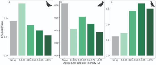 Median encounter rates for (a) Greater Sage-Grouse, (b) American Black Duck, and (c) Bobolink within bins of progressively increasing agricultural land use intensity (L). Median values are based on predictions from random forest models at thousands of random locations within each species’ geographic range (see text for details).