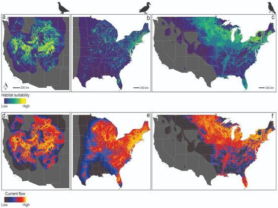 Habitat suitability (as predicted from random forest models) and the predicted probability of movement (i.e., current flow, as predicted from circuit theory-based connectivity models) for Greater Sage-Grouse in all seasons (a,d), American Black Duck during spring and fall migrations (b,e), and Bobolink during the breeding season (c,f). Model results are shown across each species’ geographic range in the U.S. (based on IUCN range maps, see text for details).