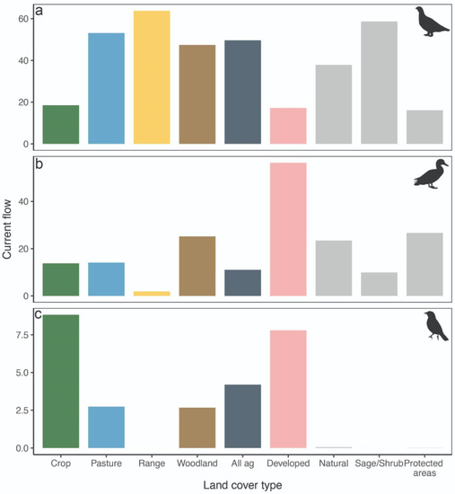 For sage-grouse, our connectivity model predicted that private rangelands support among the highest current flow values of any of the land cover types considered. This result confirms previous findings that private lands (particularly ranchlands) in the Western U.S. play an important role in supporting sage-grouse movement [16], providing critical pathways through areas of increased disturbance such as energy development [76]. Previous work has highlighted negative associations between sage-grouse and agricultural lands [77,78], and indeed our results indicate that cultivated croplands supported only low levels of current flow compared to developed areas, while overall habitat suitability declined quickly as agricultural management intensity (L) increases beyond relatively low values. However, by distinguishing between agricultural land uses and management intensities, we found that less intensively managed agricultural landscapes (rangelands, and to a lesser extent pasture and remnant tree cover on farms, i.e., “woodlands”) can potentially support sage-grouse movement.