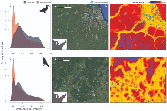 Current flow was high on developed lands for both black ducks and Bobolinks (Figure 4b,c), suggesting substantial potential for movement through suburban and urban landscapes. High predicted movement through developed areas (and correspondingly high predicted habitat suitability, Figure 3b,c) could stem in part from the tendency of community scientists to collect data in or near the cities in which they live. However, comparing detection/non-detection data for black ducks and Bobolinks suggests that encounter rates for these species are indeed higher in more developed areas; the distribution of urban land use intensities (L) at locations where birds were detected was shifted toward higher urban L values relative to non-detection locations (Figure 5) despite both detection and non-detection checklists having the same potential for spatial bias toward urban areas.