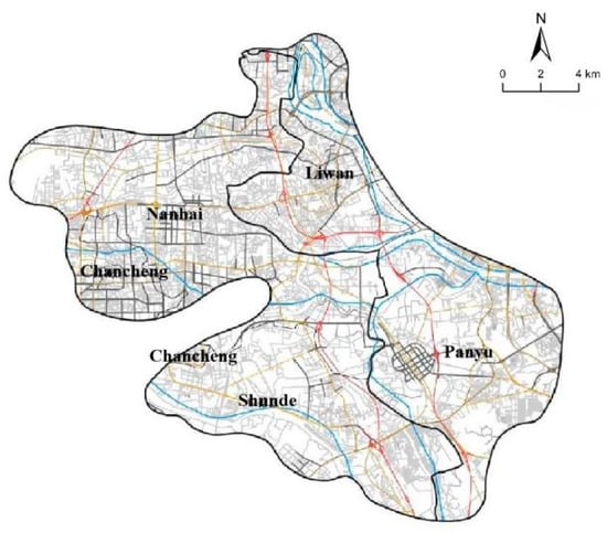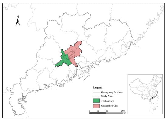 Since the 2000s, urban agglomerations have become the main form of China’s new urbanization. At present, China has approved a total of 19 urban agglomeration plans, and continues to insist on building a coordinated urban development pattern based on urban agglomerations and metropolitan areas. In 2008, the concept of city integration was first proposed by China and promoted as a national strategy in the Outline of the Reform and Development Plan for the Pearl River Delta Region []. City integration refers to two (or more) neighboring cities with conditions for integrated development in terms of economy, administration, ecological environment, culture, etc., that break administrative barriers and form an urban area with gradually increasing radiation and competitiveness []. At present, the integration strategy, with the theme of cross-border coordination and cooperation, has become an important choice in promoting coordinated regional development []. The Guangzhou-Foshan metropolitan area is one case. As modes for cross-border cooperation, the Guangzhou-Foshan metropolitan area has initiated numerous planning practices in the Pearl River Delta and completed the first global intra-city planning in China by the end of 2021. Currently, China’s city integration has developed into a deepening stage, changing from the earlier competing model supported by industries and transportation facilities, etc., and exploring a multi-dimensional integrated development model. However, in actual practice there remain problems such as divergent local interests, uneven and backward levels of joining areas, and effective links that have not yet been formed.
