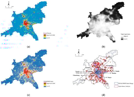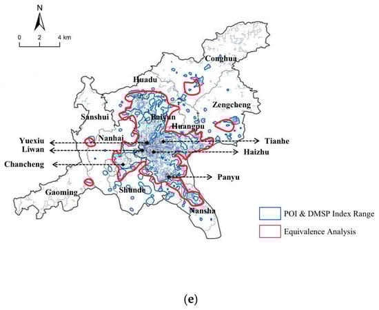 Identification results of the geographic scope of Guangzhou-Foshan core entities. (a) POI density analysis; (b) night light index analysis; (c) DMSP and POI index synthesis; (d) equivalence analysis; (e) the core entities of Guangzhou-Foshan.
