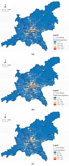 Population distribution of Guangzhou-Foshan in 2019. (a) Residential population distribution; (b) Employment population distribution; (c) Leisure population distribution.