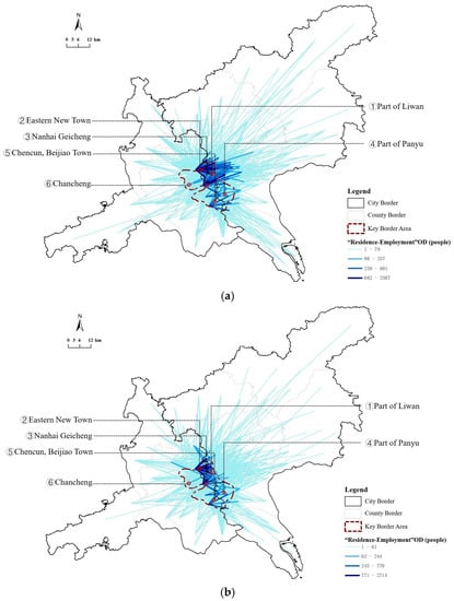 “Resident-employment” OD travel streamline of 2019. (a) The starting point (o) is in the border area; (b) The terminus (d) is in the boundary area.