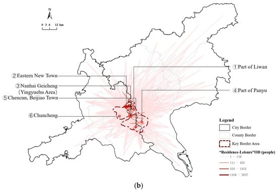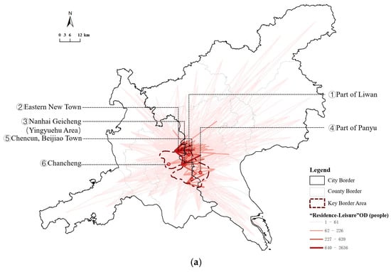 The spatial distribution of leisure activities across the city was relatively wide with a development trend of dispersion. As shown in Figure 7, the OD data indicated that the Liwan-Nanhai and Panyu-Shunde areas were closely connected. The Liwan Historical District and Panyu Changlong Resort in Guangzhou, and the Nanhai Ying Yuehu Cultural Center, Beijiao Forest Park in Foshan, all met the needs of residents in border areas for diversified cultural and entertainment activities and leisure facilities. In addition, these public resources in the study area also attracted residents from Huadu, Baiyun, Zengcheng, Sanshui, and other areas to travel across cities. Generally speaking, compared with job–housing orientation, the cross-city leisure range of residents in the border area had expanded significantly, with more long-distance trips. On the one hand, this spatial change is closely related to the rise of the regional leisure economy, as people pursue spiritual enjoyment under this rapid economic and social development. Guangzhou and Foshan share the same cultural roots and have been strengthening their cultural facilities in recent years, especially the integration of diverse cultures in the border areas to meet the growing needs of residents. On the other hand, the construction of the transportation network has also made cross-border travel and long-distance travel possible.
