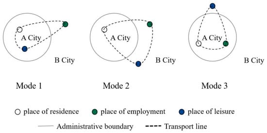 According to the distribution characteristics of residence, employment, and leisure and entertainment functions in Figure 5, Figure 6 and Figure 7, the cross-city travel modes of residents in border areas were summarized into the following three types, as shown in Figure 8. Mode 1 signifies living and working in different cities, and having leisure activity in the neighboring city. Mode 2 indicates living in a city but working and recreating in a different city, and Mode 3 represents living and working in one city, but experiencing social life and recreation in another city. Mode 3 was predominant among border residents living in either Guangzhou or Foshan, that is, the current cross-city travel of Guangzhou-Foshan residents was mostly for leisure and entertainment purposes, which was a more significant change from the original commuter-driven cross-border behavior. Moreover, cross-city leisure activities gradually changed from the previously unbalanced one-way flow characteristics, “Foshan to Guangzhou”, to the development trend of two-way circulation. This result is related to the rise of the leisure economy with the improvement of the regional economic and transportation infrastructure, as well as to the commitment of the residents from Foshan to a high-quality living environment in recent years. In short, Guangzhou-Foshan border area has developed into a fully resourced functional hub and a vibrant area with external appeal.