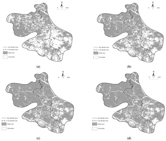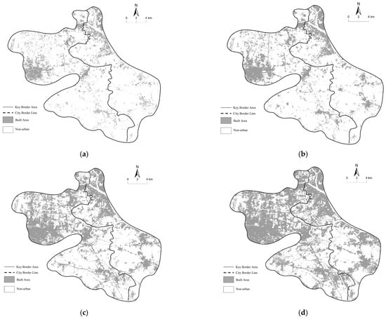 Spatial growth evolution of key border areas, 1985–2000. (a) Spatial growth in 1985; (b) Scheme 1990. (c) Spatial growth in 1995; (d) Spatial growth in 2000.