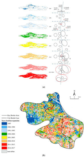 In terms of spatial morphology (see Figure 10a), during the period from 2000 to 2005, the growth axis was mainly oriented by river canals and traffic trunk lines, while the original growth cores of Shunde Daliang and Nanhai Guicheng all showed a trend of developing toward the boundary line. The junction area of Liwan and Nanhai grew rapidly, and the degrees of development and construction were greatly improved. During this period, the passenger flow interaction in the Guangzhou-Foshan cross-border area reached 460,000 passengers per day []. Clearly, the planning guidelines and industrial cooperation of the two cities were widely influencing residents’ cross-city travel behavior.