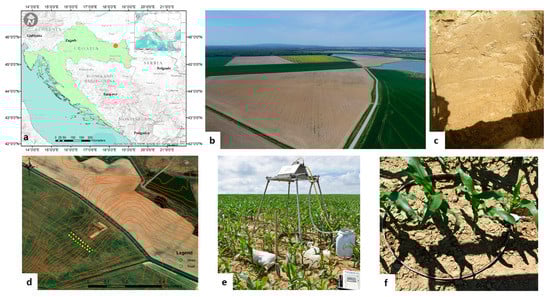 The experiment was set up in the municipality of Dežanovac, in the southern part of Bjelovar-Bilogora County, continental Croatia (Figure 1). Bjelovar-Bilogora County is a large Croatian rainfed cropland production zone, with maize, wheat, barley, soybean, and rapeseed being the dominant crop cultures. The study area is characterized by gentle hills area with dominantly silty soils developed on loess []. The studied plot has been arable land for more than two centuries, with conventional agricultural practices located at 129 m a.s.l. on a 9° slope. The climate is temperate continental, with an average rainfall of 889 mm, but with erratic distribution, particularly in the spring and autumn, when most of the high-intensity rains occur. The mean annual temperature is 10.7 °C, ranging from −0.4 °C in January to 20.6 °C in July []. Soil is silty stagnosol with low organic matter concentration and poor structure, which makes this soil type prone to compaction and erosion []. General soil properties are presented in Table 1.