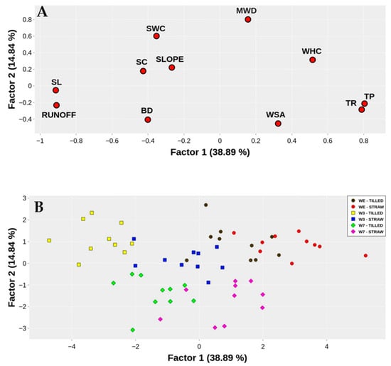 The first four factors explained 71.4% of the total variance. Factor 1 explained 38.89%, Factor 2 explained 14.84%, and Factors 3 and 4 explained 9.22% and 8.46%, respectively. Factor 1 had high positive loadings in WHC, TP, and TR, and high negative for runoff, SL, and SC (Table 4). Factor 2 had high positive loadings for SWC and MWD, and high negative loadings for WSA. Finally, Factor 3 and Factor 4 had high negative loadings in BD and slope, respectively. The intersection between Factor 1 and Factor 2 shows that runoff, SL, BD, SC, slope, and SWC are inversely related to the majority of the other variables, especially to the TP, TR, WHC, WSA and MWD (Figure 2A). The land management practices and time of measurement had different impacts on studied variables in tilled and straw treatments. The variability is lower in the W7 stage compared with the WE and W3 stages (Figure 2B).