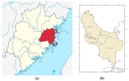 Geographic location of Fuzhou City and study area: (a) Fuzhou City location map; (b) Fuzhou City study area.