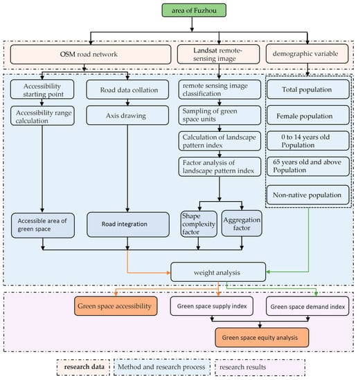 This study focuses on Fuzhou City as the research subject, using data from remote sensing images, OpenStreetMap (OSM), and demographic variables. GIS and space syntax methods were used to investigate the distribution of green space accessibility and equity in Fuzhou City. The study has roughly four parts (Figure 2).