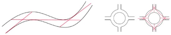 To quickly and efficiently facilitate the analysis of samples, this study uses depth map software, which was developed based on the theory of spatial syntax, to analyse the urban street network by axis analysis and line segment analysis. This study mainly adopts line segment analysis. The core work of line segment analysis is the acquisition of the axis map, which can be drawn in two ways, automatically generated by the Axial Map command in the software, or drawn by hand. This study adopts the manual drawing method to obtain the axis map. The basic principle of drawing an axis map is “longest and least” [38]. When expressing a curved street, the axis should be tangent to the boundary as much as possible to ensure the longest and the least number of axes (Figure 5).