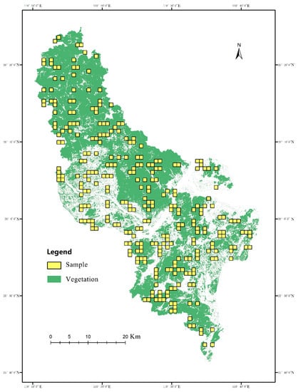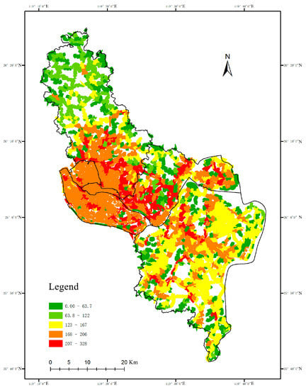 From the remote sensing images, the green space (vegetation category) in the urban areas of Fuzhou is unevenly distributed, the number of green spaces within the urban area is minimal, and the area of green spaces in the northern and northwestern parts of Fuzhou is large and widely distributed. If the landscape units are randomly selected, the pattern of green space within each is likely similar. Moreover, the proportion of green space area is similar, resulting in insufficient independent variables for landscape analysis. Specifically, we divided the study area into a 1 km × 1 km grid and used a stratified sampling method to extract green space landscape units. The stratification was based on the percentage of green space area within the grid [42,43]. According to the previous research results, the number of stratification layers was determined to be six [44]. The stratum boundary was determined by the square root method of cumulative equivalent frequency proposed by Dalenius and Hodges [42]. The sampling rate was determined using the stratified fixed ratio method, i.e., the sampling rate of each stratum was determined to be a fixed value of 20%, whereby the overall number of samples was determined to be 485 and the overall sampling rate was determined to be 20.6%. Figure 8 shows the final extracted green space landscape unit of the study area, and the vector unit was used to crop the classification data of the study area. Thus, the classification data within the landscape unit was obtained (Figure 8).