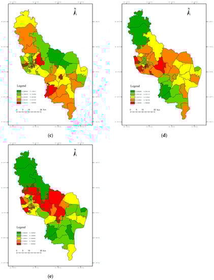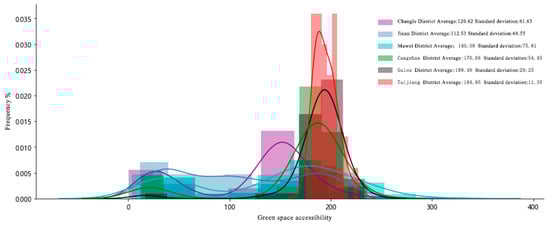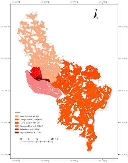 The results are shown in Figure 10. The average accessible area of Fuzhou City is 1.07 km2. The accessible area of Fuzhou City is 1.31 km2 in Taijiang District, 1.28 km2 in Gulou District, 1.09 km2 in Cangshan District, 0.99 km2 in Mawei District, and 0.89 km2 in Jinan District. The size of the accessible area depends on the development of the transportation network, which can be used as an indicator of the accessibility of the regional transportation network.
