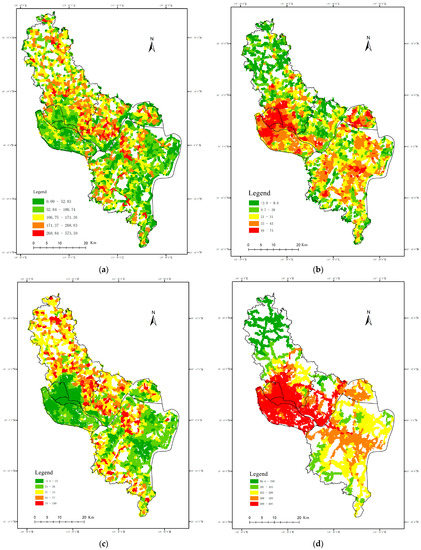 Green space area is the most widely used representative attribute in green space accessibility and equity studies [59,60]. The green space area is associated with the probability that residents can access urban green space in the study area. Urban residents have a higher probability of being exposed to urban green space when the area of green space around the city is significant. In this study, the green space area was the most fundamental indicator of green space accessibility, which was calculated based on the ranges of the available area.