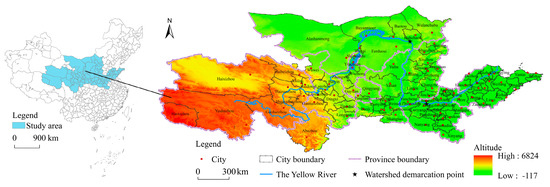 The Yellow River in the shape of “几” in Chinese, originated in the northern foothills of Bayankara Mountain on the Qinghai-Tibet Plateau, flows through Qinghai, Sichuan, Gansu, Ningxia, Inner Mongolia, Shanxi, Shaanxi, Henan, Shandong 9 provinces and regions involving 84 prefecture-level cities. With a total length of 5464 km, The Yellow River is the second longest river in Asia [1,2,3,4,5]. It contains a variety of terrains, such as plateaus, hills, basins, and plains, with obvious differences in topography and geomorphology and an elevation range of more than 4000 m. The boundary point between the upper and middle reaches of the Yellow River is in Hekou Town of Inner Mongolia; the middle and lower reaches is in the Taohua Valley of Henan Province. The Yellow River Basin connects Kunlun Mountain in the west, Yin Mountain in the north, Qin Mountain in the south, Bohai Sea in the east, and central and western parts of China. The Yellow River Basin is an important ecological security barrier in China, as well as an important area for population activity and economic development, and has a pivotal strategic position in the national development and socialist modernization construction. A total of 84 prefecture-level cities that the Yellow River System flows through were taken as the research areas (Figure 1).