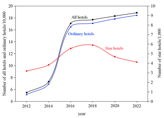 - In the process of rapid development of the hotel industry, the correlation coefficient between the number of ordinary hotels and the number of star hotels is 0.813, indicating that there is a strong correlation between the dynamic changes of the numbers, indicating that there is a promotion relationship between the development of different types of hotels. All figures and tables should be cited in the main text as Figure 1, Table 1, etc.