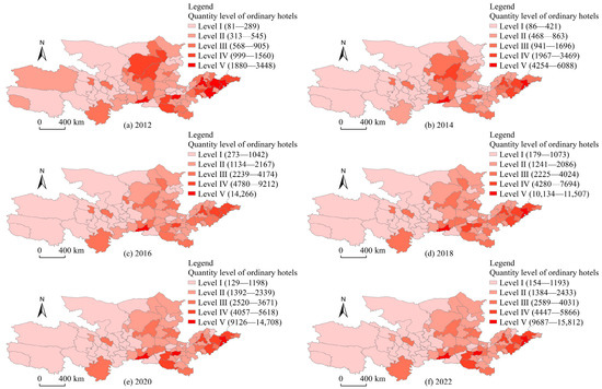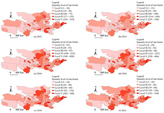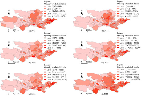 According to the statistics of the hotel industry from 2012 to 2022, the total number of hotels, the number of ordinary hotels and the number of star-level hotels are visualized in Figure 3, Figure 4 and Figure 5, which reflect the differences in the spatial pattern of the hotel industry. In order to facilitate the description of the visualization results, Level I and Level II are divided into low values, Level III is divided into median values, and Level IV and V are divided into high values.