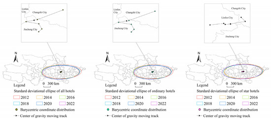 (1) The focus of the hotel industry moved significantly. The center of the standard deviation ellipse reflects the center of gravity of the hotel industry in space. On the whole, the moving track of the center of gravity of the hotel industry’s spatial distribution showed that it moved first to the southwest and then to the southeast. In 2012, the distribution center of the hotel industry was located in Changzhi City, Shanxi Province. In 2014, the center of gravity moved to Jincheng City. In 2016, the center of gravity continued to move to the southwest to Linfen City. In 2018–2022, the distribution center shifted to the southeast and all were located in Jincheng City. In terms of classification, the ordinary hotels and the hotel industry had the same overall changes; the center of gravity of star hotels showed a trend of moving to the southeast and then to the west, and the center of gravity position changed significantly. In 2012 and 2014, the distribution centers of star hotels were located in Changzhi City, Shanxi Province, with a trend of moving to the southeast. In 2016–2022, the center of gravity moved to the west on the basis of 2014, all located in Linfen City, Shanxi Province. The shift of all spatial distribution centers reflected their quantitative changes in the spatial pattern.