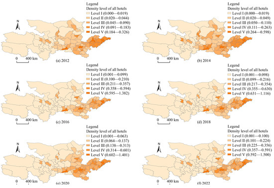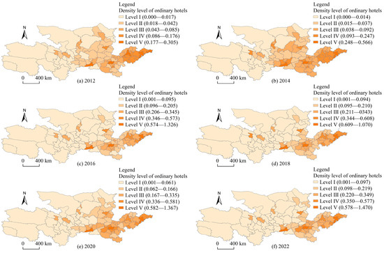 Ordinary hotels had the similar spatial distribution density with the total hotels. The fluctuation of the high-density distribution area was reduced and gradually concentrated. Figure 8 showed that in 2012, the maximum density of total hotels was 0.305/km2 in Qingdao, Shandong, and the minimum density of total hotels was only 0.0003/km2 in Yushu, Qinghai. The difference between the above densities was 947 times; since then, the density value of hotels in various cities fluctuated and increased, and the density difference between cities gradually expanded. By 2022, the max hotel density increased to 1.47 hotels/km2 in Xi’an, Shaanxi. The min hotel density was only 0.001 hotels/km2 still in Yushu, Qinghai. The further expanded density difference was 2054 times. From the perspective of regional distribution, in 2012, 2014 and 2020, the areas with the middle and high total hotel density were widely distributed in Shaanxi, Shanxi, Henan and Shandong; however, in 2016, 2018 and 2022, the areas with high and medium total hotel density relatively concentrated, mainly in Shandong and Henan. There were also areas with high total density in other capitals, and most other cities had low total density. In general, the ordinary hotel density in the Yellow River Basin and the total density maintained the same trend.