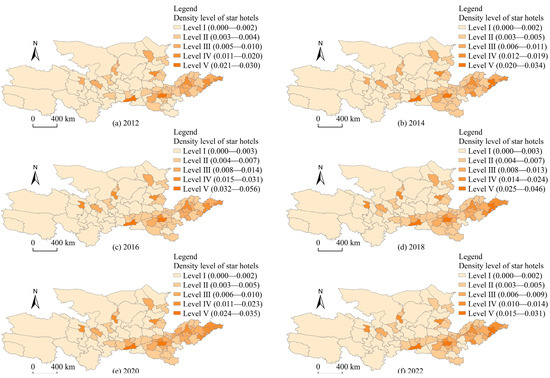 The regional difference of star hotels fluctuated slightly, and the city density increased first and then decreased. Figure 9 indicated that during 2012–2022, the high-density areas of star hotels were mainly in the provincial capitals, while the sub-high-density and medium-density areas were around these capitals. In addition, Henan in the lower reach had a large population density and relatively developed economy, and the star hotel density was relatively high. However, in the Qinghai-Tibet Plateau and the north-central Loess Plateau, the star hotel density was lower due to the low population density and economy. The star hotel density in 2012 was 0.03/km2 in Zhengzhou City, Henan. Since then, the star hotel density had gradually increased in 2014 and 2016. By 2016, the maximum star hotel density was 0.056/km2 in Xi’an, Shaanxi. After 2016, the star hotel density had gradually decreased in the whole. By 2022, the maximum density of star hotels reduced to 0.031/km2. Thus, the star hotel density and the total density had the same trend.