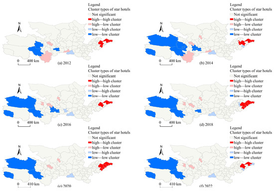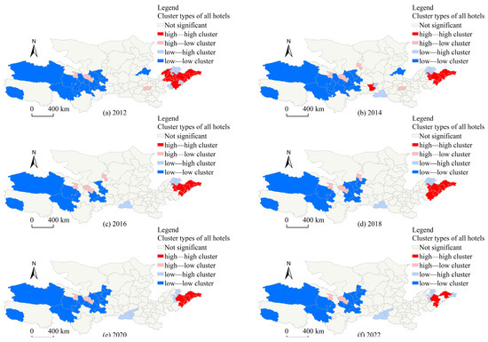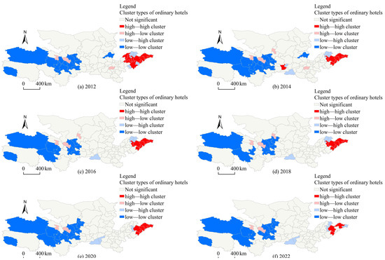 According to the Moran’s I index of global spatial autocorrelation (Table 2), there were significant differences in the global spatial autocorrelation characteristics. From 2012 to 2022, the global Moran’s I value of the total hotels and ordinary hotels showed a fluctuating downward trend, and the global spatial autocorrelation Z value of the total hotels and ordinary hotels in 2022 was less than 1.65, indicating that the aggregation degree of the total hotels and ordinary hotels between geographical units gradually declined and showed a random distribution trend in 2022. The Z values of the global spatial autocorrelation of star hotels were between [−1.65, 1.65]. The Moran’s I had positive and negative values in different years, which indicated the weak degree of spatial agglomeration of star hotels and a random distribution state. The star hotel discretization had a spatial negative autocorrelation and the star hotel agglomeration had a positive spatial correlation.