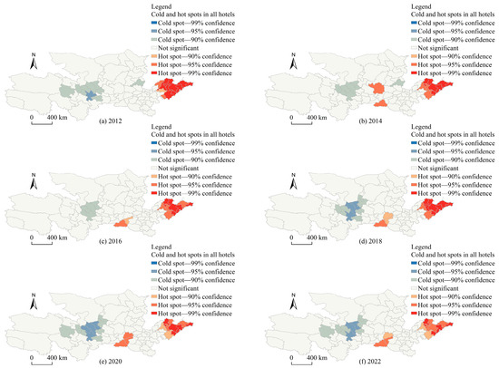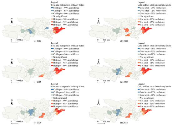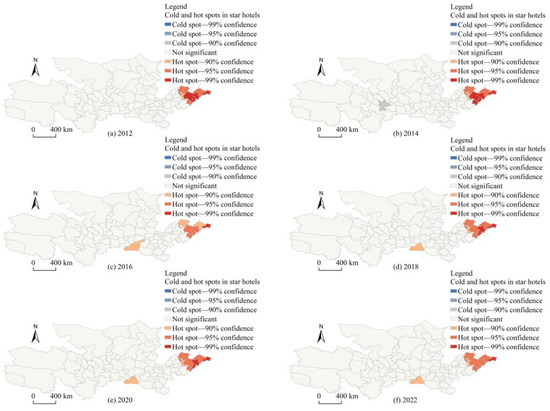 Figure 14 indicated that the cold spots of ordinary hotels are highly consistent with the distribution of total hotels. The number of cold spots decreased first and then increased. The number of non-significant areas and cold spots kept the opposite change trend, while the total number of hot spots remained stable. However, the number of hot spots in different grades changed significantly. The distribution of primary cold spots and primary hot spots was most concentrated, and there were secondary and tertiary cold spots around the primary cold spots.