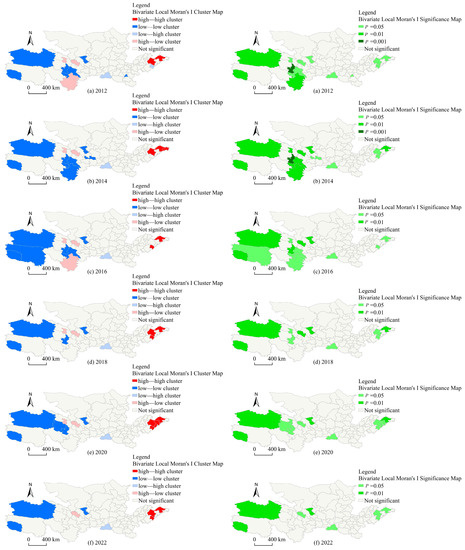 The total number of cold spots decreased first and then increased, the number of non-significant areas increased first and then decreased, the total number of hot spots remained stable, and the number of hot spots at different levels changed significantly. Figure 13 presented that in terms of regional distribution, the cold spots were mainly concentrated in the transition zone from the first ladder to the second ladder of China’s terrain, the hot spots were mainly concentrated in the downstream Shandong Peninsula, with the most inconspicuous cities and the widest area distribution. There was no first-level cold spot in the total number of hot spots and cold spots. The number of level II cold spots was only 1 In 2012, which disappeared in 2014 and 2016, and appeared 3 in 2018–2022. The number of level III cold spots was 9, 7, 5, 7 in 2014, 2016, 2012, and 2018–2022 respectively. The number of non-significant cities increased gradually in 2012–2016, and then kept the similar level in 2018–2022. The number of level III hot spots increased slightly in the past decade; the number of secondary hot spots increased from 2 in 2012 to 6 in 2022. The trend of the first-level hot spots was opposite to that of the second-level hot spots, from 10 in 2012 to 4 in 2022. Based on the above analysis, the number of hot spots basically remained stable in the past decade, but the number of primary and secondary hot spots increased and decreased significantly.