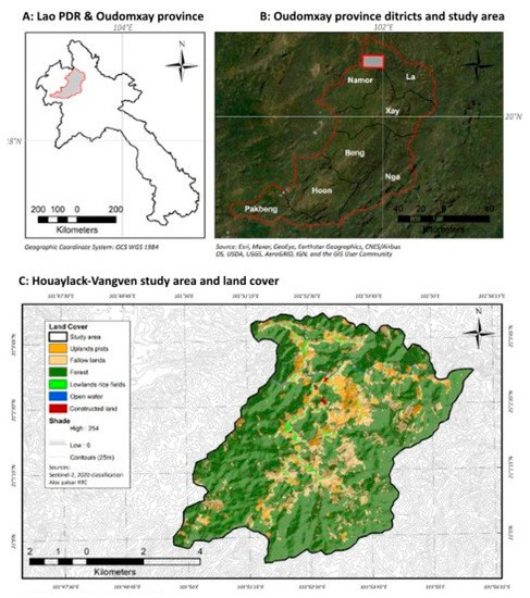 This work was made possible thanks to our collaboration with CCL (https://ccl-laos.org/about-ccl/ accessed on 29 March 2023), a Franco-Lao non-governmental organisation that has been working in Oudomxay Province since 2012 at the invitation of the Provincial Department of Agriculture and Forestry (PAFO). In May 2018, the project to support agricultural development in the mountainous areas of La and Namor districts, Oudomxay Province, second phase (PDPO2) began. As part of this collaboration, fieldwork permits were obtained. A comprehensive report of our work was submitted at the end of our mission to the CCL and the PAFO. We would like to thank the various project teams (CCL and DAFO, District Agriculture and Forest Office) and institutional (PAFO) and technical (SAEDA, Sustainable Agriculture and Environment Development Association) partners who allowed and facilitated the accomplishment of this study. In particular, the authors would like to thank Vincent Couderc for their support in this work.