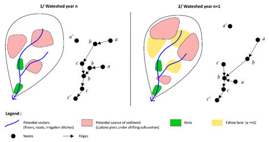 Numerous processes can induce sediment transfers through the watershed by sediment fluxes, but connectivity is mainly controlled by hydro-meteorological forcing, as well as by the intrinsic properties of the system [49]. Our method relies on sediment connectivity identification and spatialisation using a morphological and network analysis approach. The network structure between specific sediment sources and sinks within a catchment can be abstracted by graph theory applied to geomorphology [45,50,51,52,53]. To analyse the spatial distribution of sediments and their pathways, the graph theory such as that used by Heckman and Schwanghart, 2013 [51], considers a succession of nodes (sediment sources, sinks, and outlet) and edges (sediment pathway) into the watershed to understand their spatial interactions linked to geomorphic processes. Sediment storage and remobilisation can be formalised by graph theory (Figure 2) to highlight the connection between upslope compartments considered as contributing areas and downslope sinks. This formalisation seems to be well adapted to our study area, in that it helps identify changes in sediment connectivity in relation to the landscape dynamics of swidden agriculture. Therefore, the contribution of a connectivity framework is twofold: (1) the identification of various components of the landscape such as sediment sources, compartments, or geomorphic units [54,55] and their physical linkages; and (2) the identification of sediment transfer modalities.