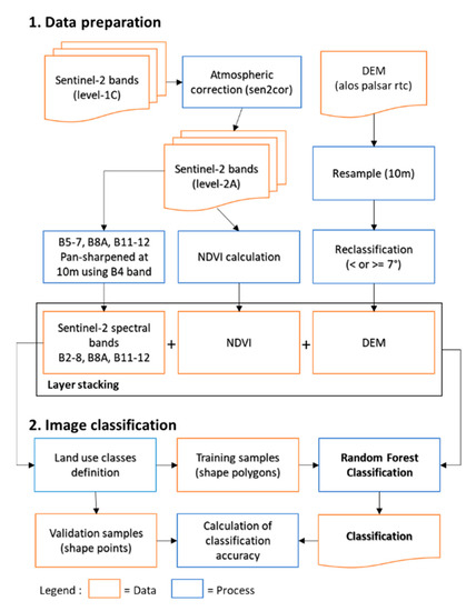 To complete the information from Sentinel-2 images, a Digital Elevation Model (DEM) to differentiate sediment sources, located upstream of the slopes, and sediment sinks, located on floodplains, relying on the slope gradient was used. ALOS PALSAR RTC (Radiometric Terrain Correction) DEM (Digital Elevation Model) was integrated into the dataset for topography analysis and drainage extraction. The 12.5 m ALOS DEM was resampled to 10 m to fit with the Sentinel-2 image resolution. To identify the slope threshold, the DEM was reclassified to differentiate the cells above and below 7 degrees. This threshold could be obtained through empirical field analysis, and provides a limit between lowlands and uplands, as we could not find rice terraces with a slope greater than 7 degrees in the region. Finally, the dataset employed for image classification was composed of 12 raster images integrating several spectral bands, DEM, and vegetation index values.